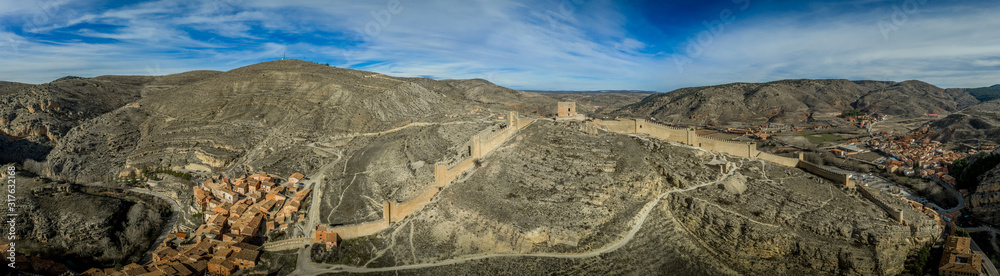 Aerial panorama view of Albarracin in Teruel Spain, with red sandstone terracotta medieval houses, Moorish castle and ancient city walls voted most beautiful Spanish village