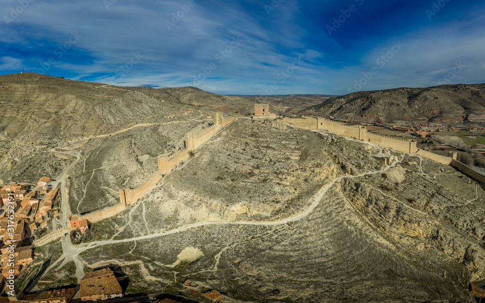 Aerial panorama view of Albarracin in Teruel Spain, with red sandstone terracotta medieval houses, Moorish castle and ancient city walls voted most beautiful Spanish village