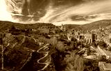 Aerial panorama view of Albarracin in Teruel Spain, with red sandstone terracotta medieval houses, Moorish castle and ancient city walls voted most beautiful Spanish village