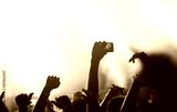 Hand with a phone records live music festival. People taking photographs with smart phone during a public music concert. Crowd raising their hands, dancing and enjoying great the concert.