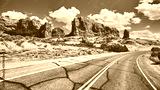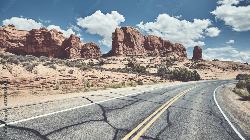 Scenic road in Arches National Park, color toning applied, Utah, USA.