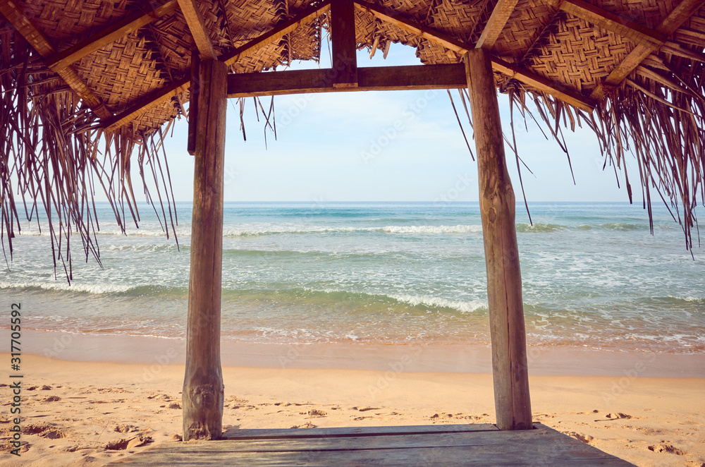 Tropical beach wooden shade, color toning applied, summer vacation concept.