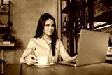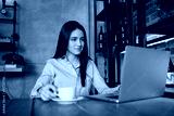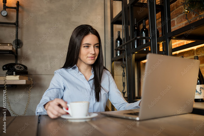 Portrait of handsome curly business woman sitting and working in city cafe with laptop and smiling