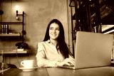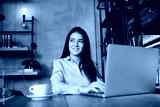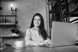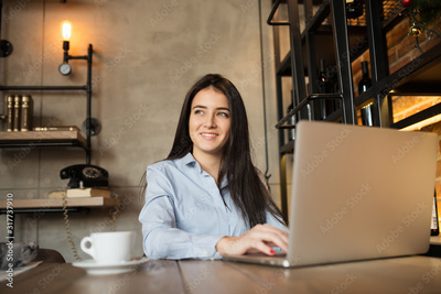 Portrait of handsome curly business woman sitting and working in city cafe with laptop and smiling