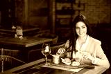 Businesswoman sitting in restaurant and eats after work