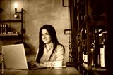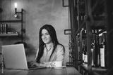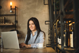 Portrait of handsome curly business woman sitting and working in city cafe with laptop and smiling