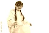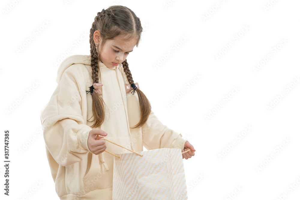 Sad, unhappy little girl with pigtails dressed in beige hoodie holds shoping package in hands and looking inside, isolated over white background