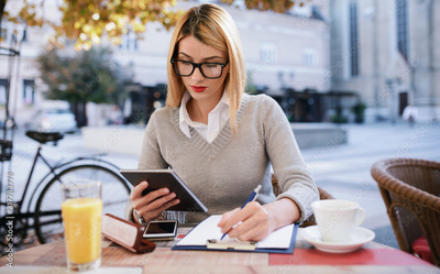 Student female sitting in the cafe and making a notes for the seminar work. Education, lifestyle concept