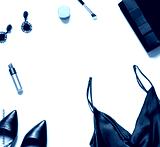 Fashion clothes, cosmetics and accessories concept frame on the white background. Online shopping composition top view.