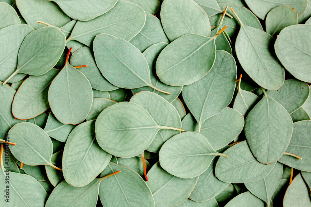 Background/Texture made of green eucalyptus leaves. Flat lay, top view