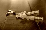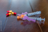 Syringes with pills on wooden background. Coronavirus 2019 China- health and medical concept- addiction concept