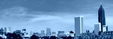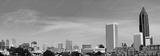 Downtown Atlanta Skyline showing several prominent buildings, apartments, offices and hotels under a blue sky.