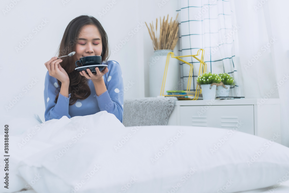 Asian cute woman drink coffee on bed in morning after getting up