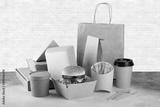 Recycling concept. Delivery food background. Fast food eco packaging with tasty hamburger, french fries, paper coffee cup and soup