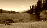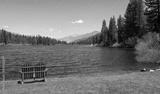 Landscape of red chair by Hume Lake with view of forest and mountains at Kings Canyon National Park in California