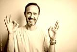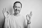 Middle age hoary man wearing casual t-shirt standing over isolated pink background relax and smiling with eyes closed doing meditation gesture with fingers. Yoga concept.