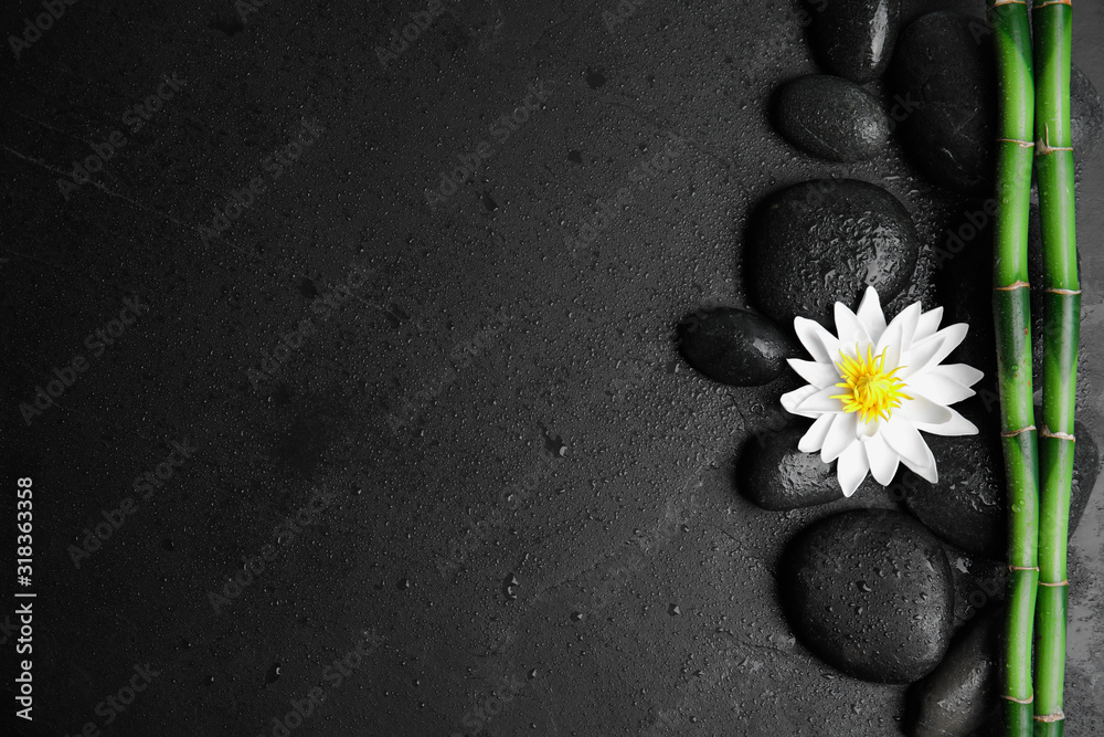 Stones, bamboo, lotus flower and space for text on wet black background, flat lay. Zen lifestyle