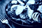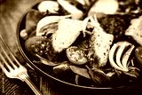 Caesar salad - barbecue chicken breast and vegetables on wooden table