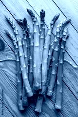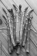 Green asparagus sprout on wooden board closeup. Top view flat lay. Food photography