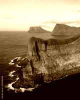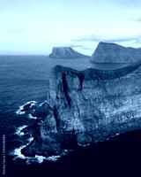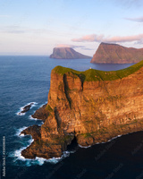 Aerial drone ptoto flying over Kallur lighthouse on green hills of Kalsoy island, Faroe islands, Denmark. Landscape photography