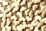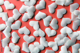 White textile hearts on red paper. Valentines day background, creative texture and love concept