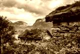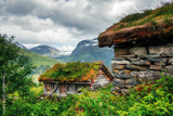 Typical norwegian old wooden houses with grass roofs near Sunnylvsfjorden fjord and famous Seven Sisters waterfalls, western Norway. Landscape photography