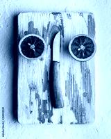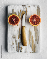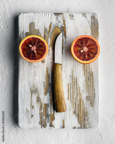 Orange half pieces with knife on white wooden board closeup. Healthy diet vitamin concept. Food photography