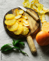 Orange pieces on grey plate closeup. Healthy diet vitamin concept. Food photography