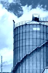 Agricultural silo at feed mill factory. Big tank for store grain in feed manufacturing. Seed stock tower for animal feed production. Commercial feed for livestock, swine and fish industries.
