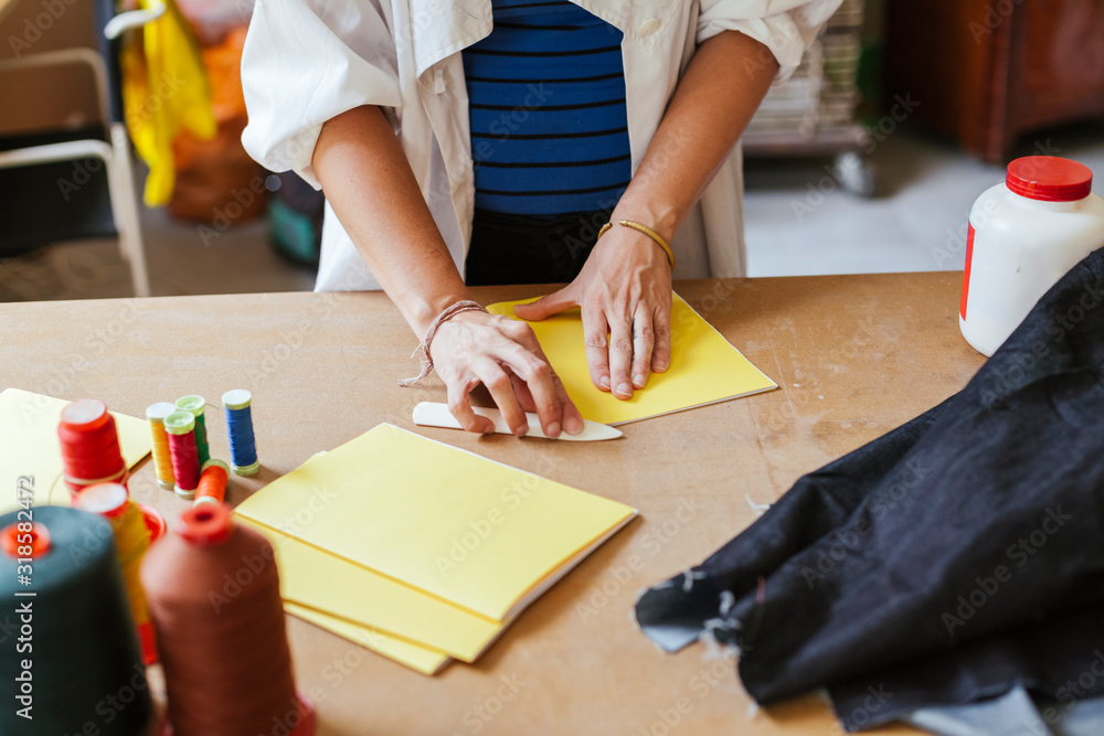 Young adult artisan woman making a notebook in his laboratory - Millennial at work