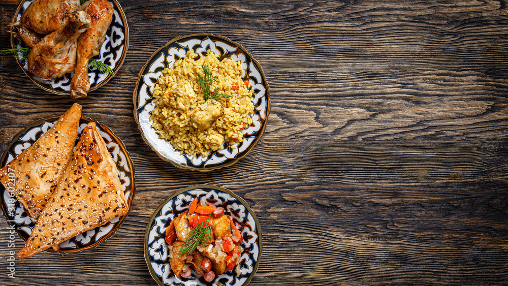 Eastern cuisine. Homemade Uzbek dishes, pilaf, chicken, samsa, Korean carrot salad on a wooden background. baner background image, copy space text, top view