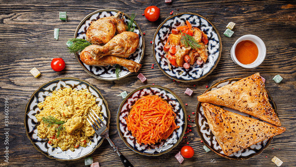 Eastern cuisine. Homemade Uzbek dishes, pilaf, chicken, samsa, Korean carrot salad on a wooden background. baner background image, copy space text, top view
