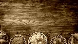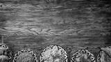 Eastern cuisine. Homemade Uzbek dishes, pilaf, chicken, samsa, Korean carrot salad on a wooden background. baner background image, copy space text, top view