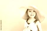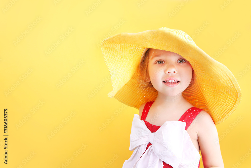 Caucasian child girl in hat on yellow empty space background,summer holiday,vocation.