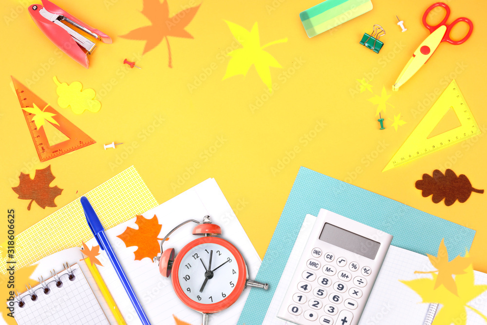 School office supplies,accessories on yellow background top view.Back to school concept empty copy space.