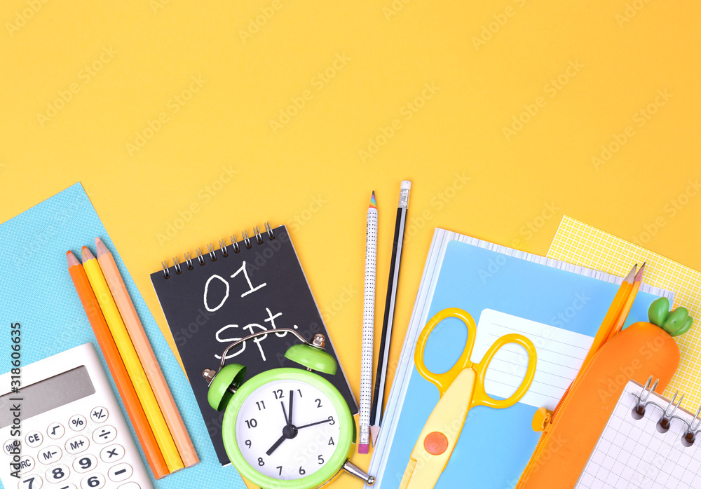 School supplies top view,back to school concept.September first flat lay objects.