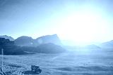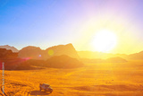 Spectacular sandstone and granite rock of Wadi Rum and Valley of the Moon at sunset light in southern Jordan. Popular tourist destination in Jordan desert.