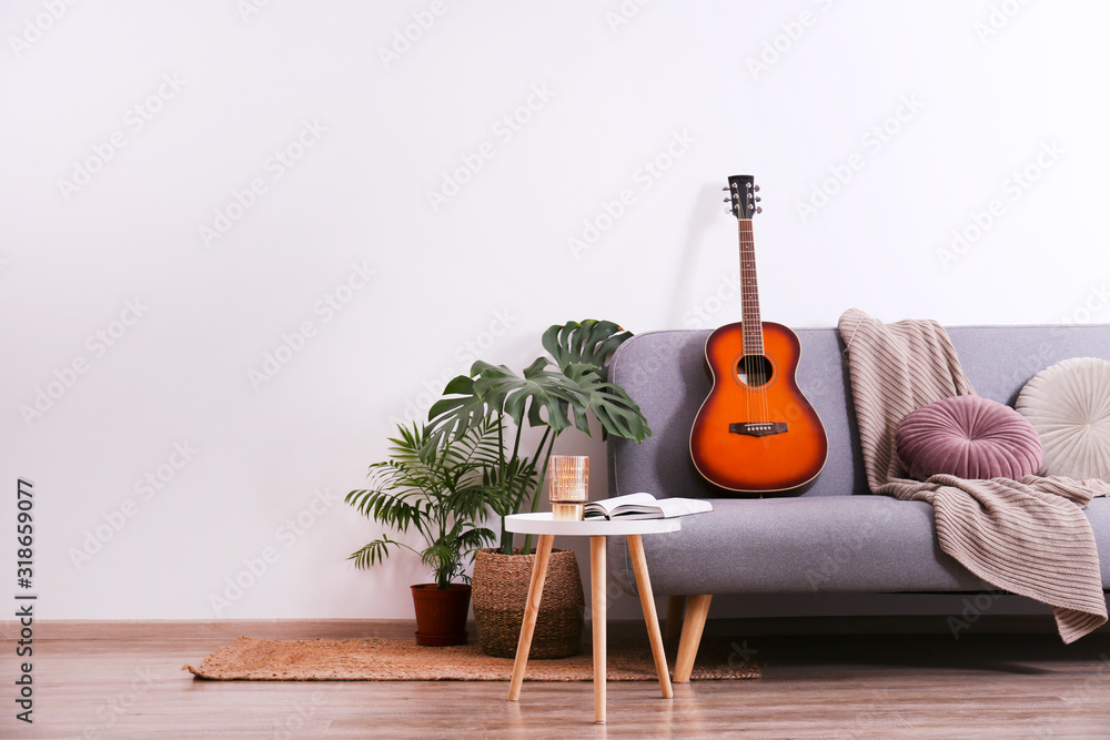 Minimalistic interior design concept. Acoustic guitar on grey textile sofa in spacious room of loft style apartment with wood textured laminated flooring. Background, copy space, close up.