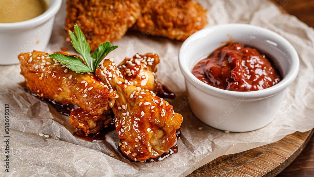 Asian cuisine Glazed fried chicken legs with spicy chili sauce and sesame seeds. Serving dishes in a restaurant on white parchment. background image, copy space text
