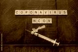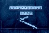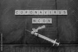 Coronavirus NCOV made out of wooden tiles with a syringe on a wooden background: health and medical concept