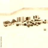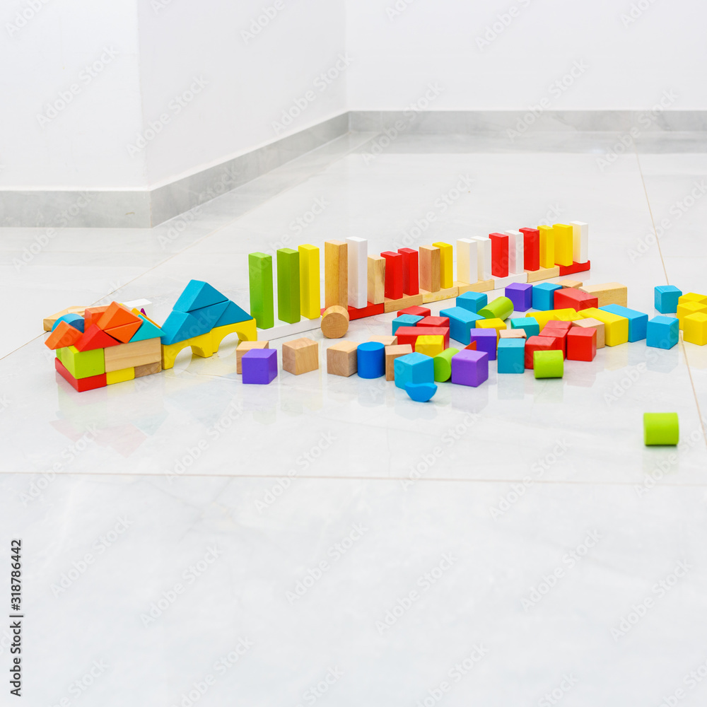 Different color and shape wooden toy building blocks in home on grey tiles floor.