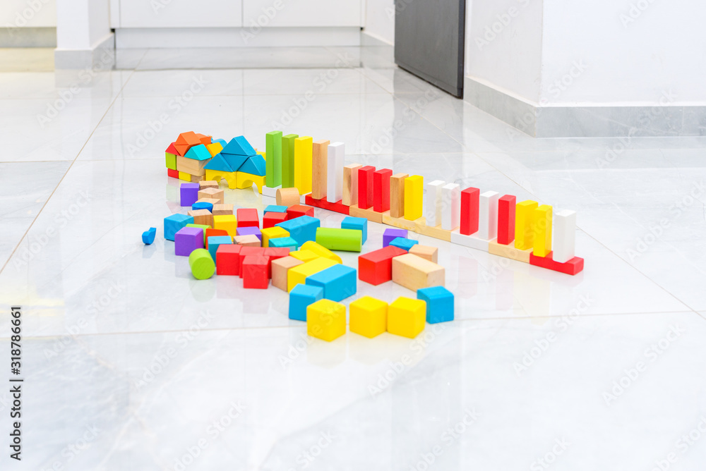 Different color and shape wooden toy building blocks in home on grey tiles floor.