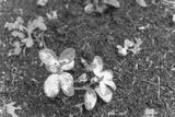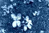 Young broad bean and snap pea plants growing in raised bed with snow cover near Dallas, Texas