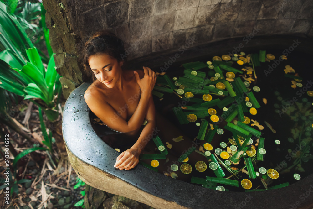 Beautiful young woman enjoying in outdoor spa. Luxury stone bath tub with jungle view. Natural organic tropical ingredients in the water: ginger, lime, orange and sea salt. Beauty treatment concept.