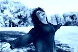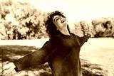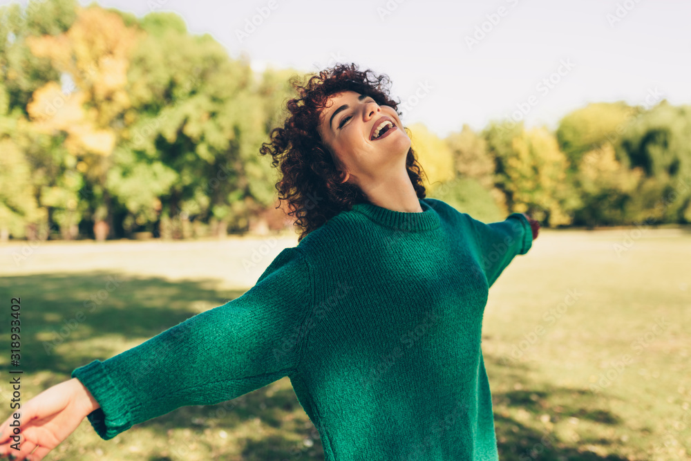 Horizontal image of happy young woman smiling posing against nature background with windy curly hair, have positive expression, wearing in green sweater. People, travel and lifestyle concept.