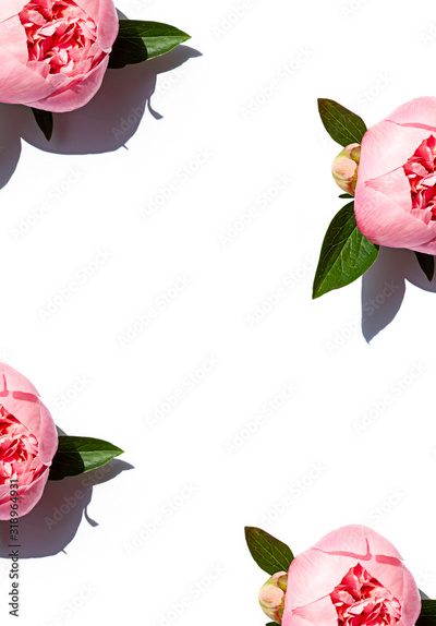 Beautiful pink peony flower blooming frame on the white background. Top view. Copy space