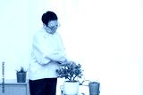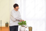Active happy senior woman removes dead leaves from an indoor plant in the home garden. House plants in flower pots in the garden room, indoor.