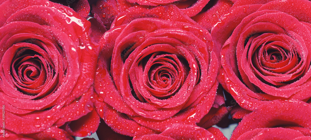 A close up macro shot of a red rose. Red rose flower, petals. Bouquet of flowers, fresh red rose. Collage of red roses. Bouquet of fresh roses, flower bright background