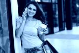 Woman talking to the phone and walking near mall with coffee after shopping.