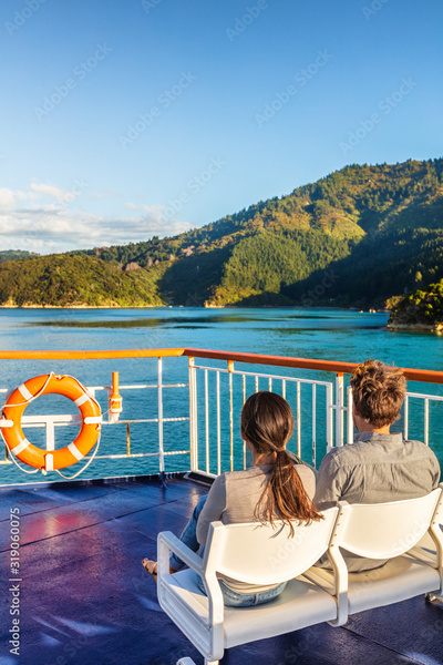 New Zealand Cruise ship ferry travel couple tourists relaxing enjoying sunset view of Cook Strait, Marlborough Sounds.